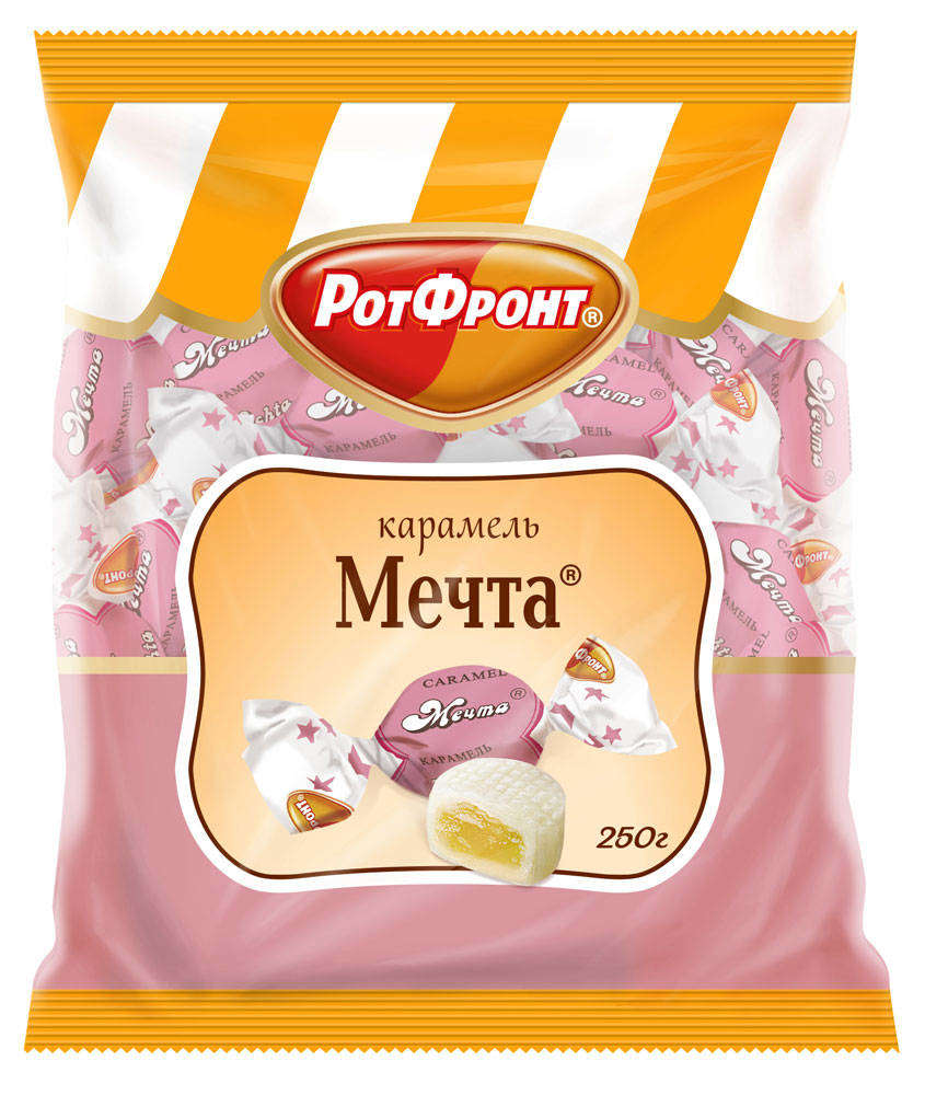 Карамель «Мечта» от фабрики «Рот Фронт» – округлые «шайбочки» конфет с мелким вафельным орнаментом. Внутри – помадная начинка с добавлением цитрусового повидла. Нежный сахарный вкус белой карамели, хрустящей и немного тягучей, дополняется тонкой кислинкой помадной начинки. Любимые с детства карамельки!