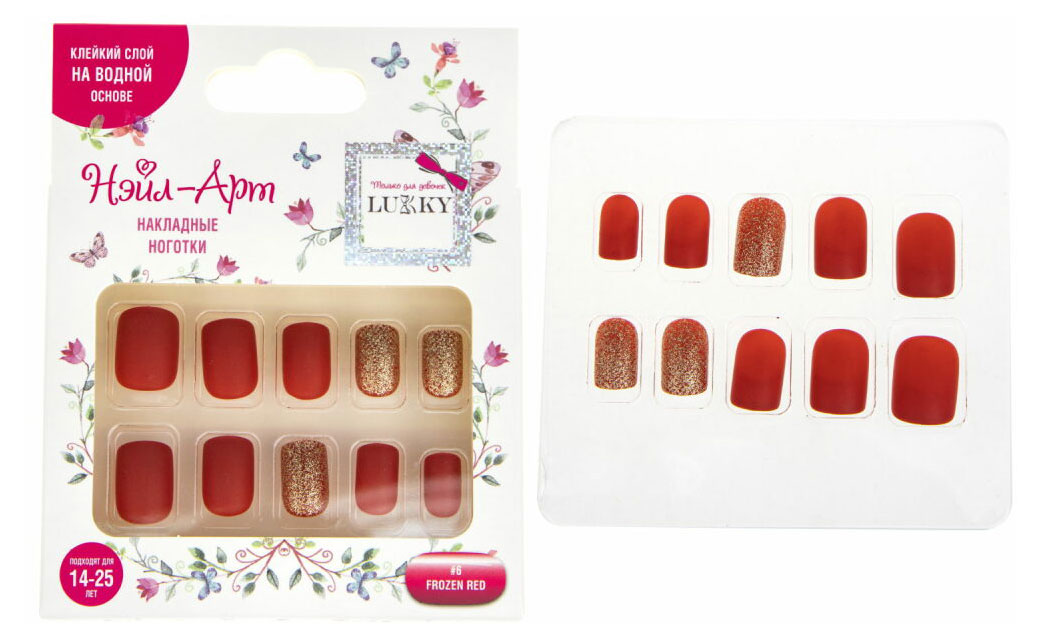 Приближается пора Новогодних праздников и волшебства. Красивый маникюр должен подходить к праздничному наряду, а также быть модным и эффектным. Красные и золотые оттенки напоминают о приближающимся светлом и теплом празднике. Чтобы сэкономить свое время и заняться более важными делами, бренд Lukky представляет новинку, накладные ногти. Они крепятся на ноготь всего за 10 минут! Удали с ногтей лак и грязь, подпили искусственные ногти, если это требуется в зависимости от размера твоих собственных ногтей, расположи накладной ноготь на чистой поверхности ногтя, прижми и подержи 10 секунд. Снимаются накладные ногти так же легко: подержи ногти в теплой воде в течение 10 минут, а после аккуратно отдели покрытие от натуральных ногтей. Накладные ногти на клеевой основе могут использоваться несколько раз. Товар представлен в ассортименте, без возможности выбора.