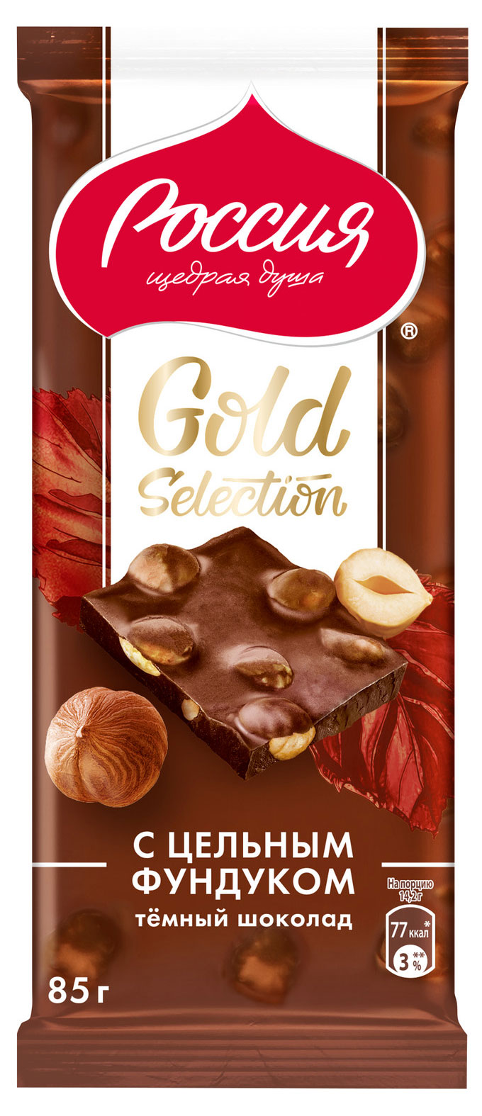Богатое содержание фундука в насыщенном темном шоколаде «РОССИЯ» - ЩЕДРАЯ ДУША! GOLD SELECTION. В каждом кусочке раскрывается яркий вкус превосходного сочетания орехов и шоколада. Любимая комбинация, выдержанная в безупречном стиле для ценителей классического темного шоколада. Прекрасно подходит для того, чтобы побаловать себя и угостить окружающих.