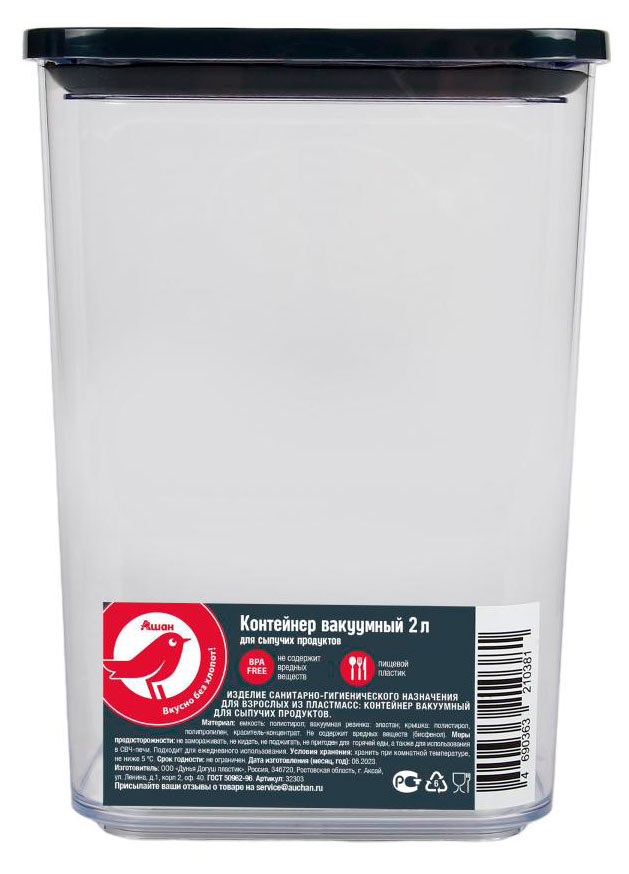 Контейнер АШАН Красная птица - вакуумная емкость для хранения сыпучих продуктов. Распределите в нем крупу, граноллу, макароны или муку. Благодаря плотно закрывающейся крышке, пища не просыпается. В серии представлен широкий выбор контейнеров разного объёма. Вместимость данного изделия - 2 л. С заботой о вашем комфорте от АШАН Красная птица!