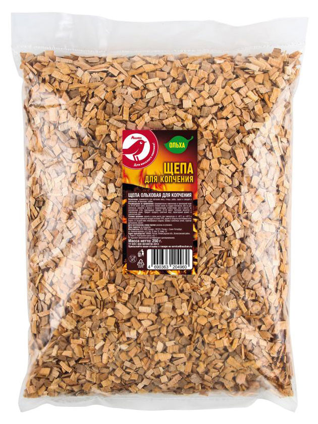 Ольховая щепа АШАН Красная птица - древесное сырье для копчения продуктов горячим или холодным способом. Благодаря ей, ваше мясо, птица или рыба приобретают приятный вкус и тонкий аромат. Это полностью натуральное изделие пригодится вам в период летнего барбекю. Все для вашего отдыха от АШАН Красная птица!