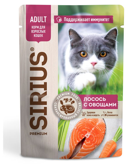Влажный корм для взрослых SIRIUS Premium Adult полнорационный кусочки в соусе лосось с овощами, 85 г