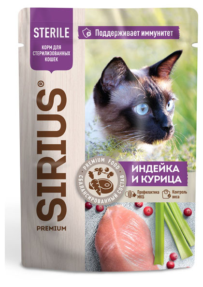 SIRIUS — влажный корм премиум-класса для полноценного ежедневного рациона стерилизованных кошек. Высокое содержание мясных ингредиентов обеспечивает оптимальный уровень белка и укрепляет мышцы. Пониженное содержание жиров для контроля веса. Корм содержит натуральные ингредиенты, а также все необходимые микроэлементы и витамины для здорового роста и развития питомца. Клюква способствует профилактике инфекций мочеполовой системы.