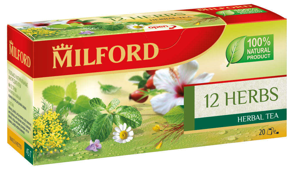 Чай MILFORD 12 трав – уникальная композиция из полезных и вкусных трав. Входящие в его состав травы богаты биологически активными веществами. Они благотворно влияют на организм, укрепляют жизненные силы. Не содержит кофеин. 100% натуральный продукт.