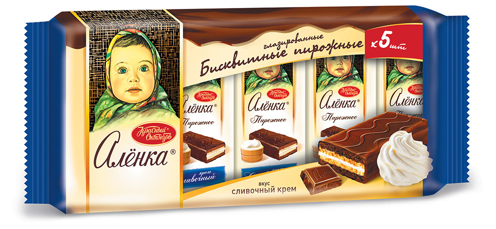 Пирожные бисквитные глазированные кондитерской глазурью, прослоенные кремом «Аленка» вкус сливочный крем.