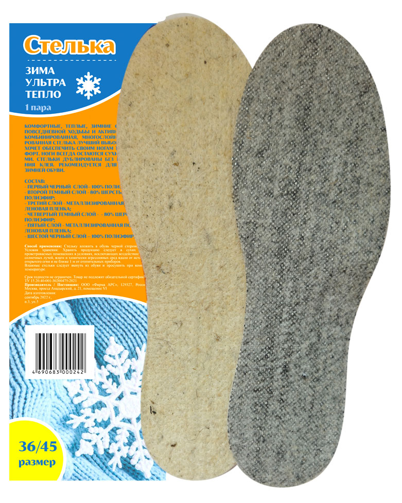 Стельки для обуви многослойные шерстяные, р 36/45