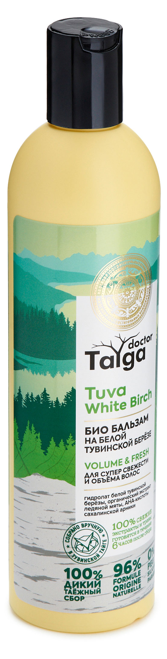 Био бальзам для супер свежести и объёма волос VOLUME & FRESH Tuva White Birch Идеальное сочетание свежести и легкости. Волосы сохраняют упругий объем, приобретают роскошный блеск и силу. Супер объем без утяжеления Наполняет свежестью и легкостью Ультра защита тонких и ослабленных волос во время укладки БЕЛАЯ БЕРЕЗА – ТАЕЖНЫЙ СУПЕРФУД ДЛЯ ВОЛОС. Органический гидролат белой тувинской березы на 85% состоит из бетулиновой кислоты – таежного суперфуда и антиоксиданта для волос. В дикой ледяной мяте содержание эфирного масла до 5 раз выше, чем в обычной. Эффективно тонизирует и освежает волосы по всей длине, придает волосам здоровый блеск и силу. AHA – кислоты сахалинской арники усиливают природный блеск волос и облегчают расчесывание.