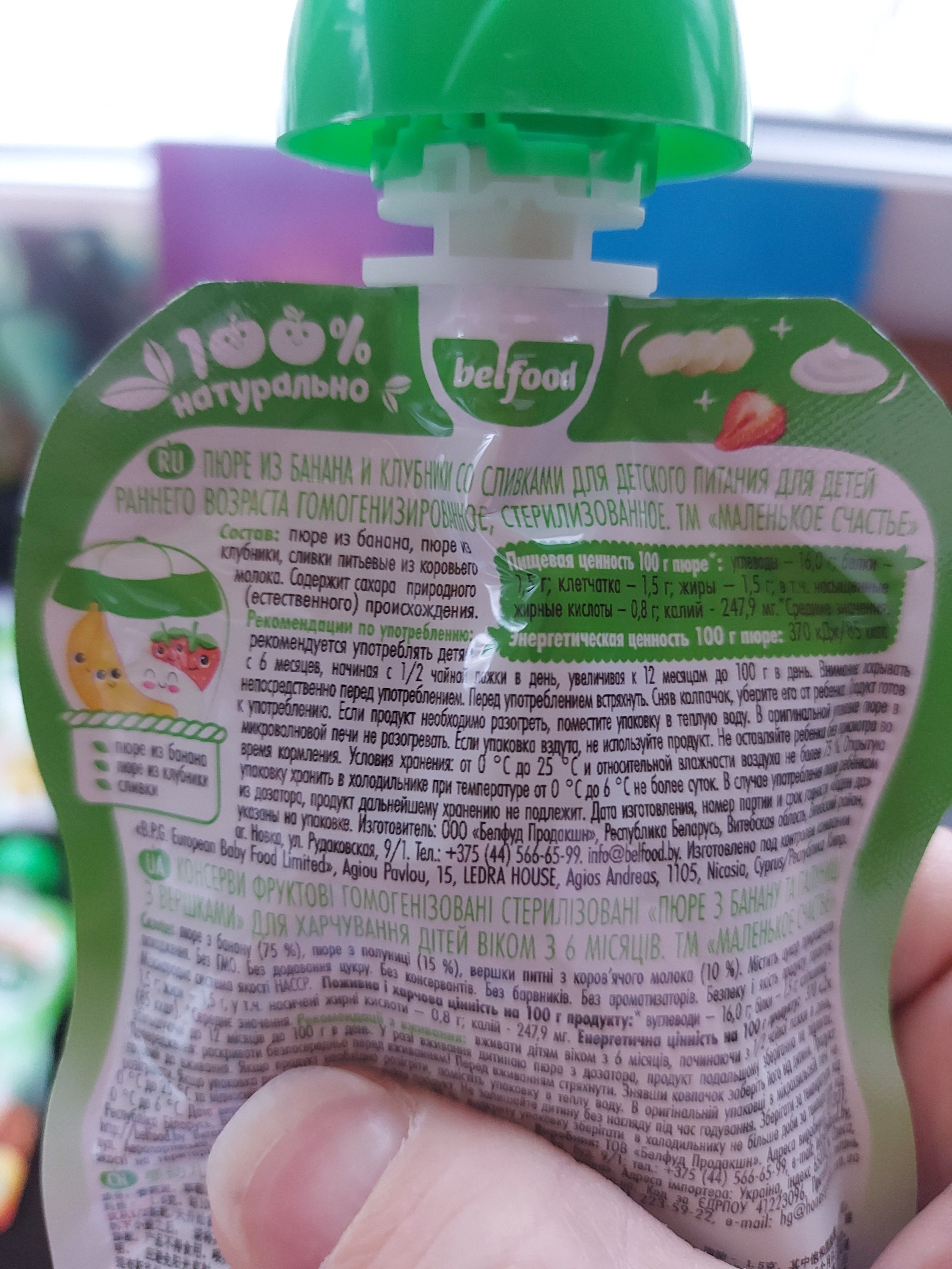 СоставПюре "Маленькое счастье" клубника-банан-сливки содержит следующие ингредиенты: