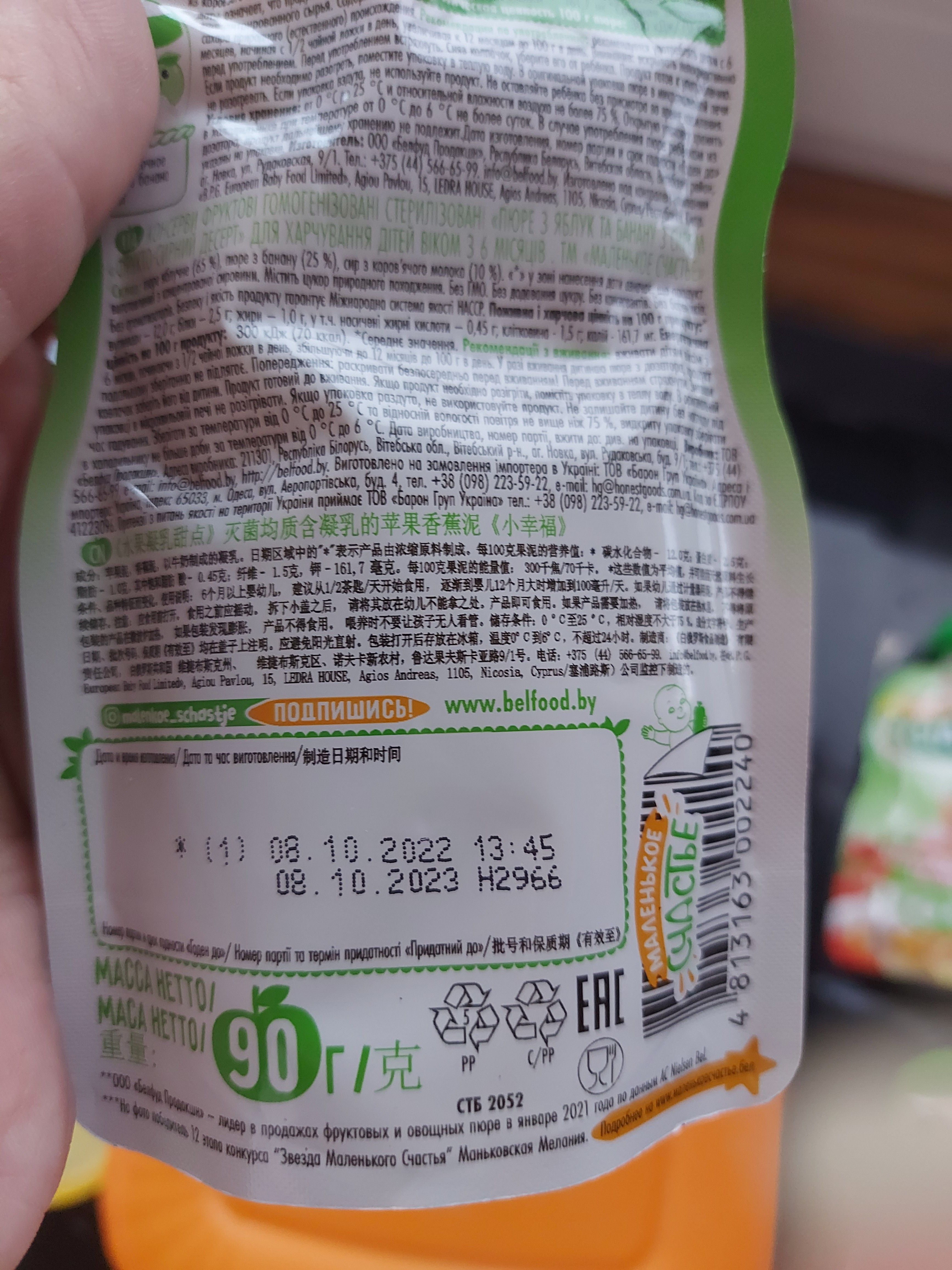 Состав: пюре яблочное, пюре из банана, творог из коровьего молока.