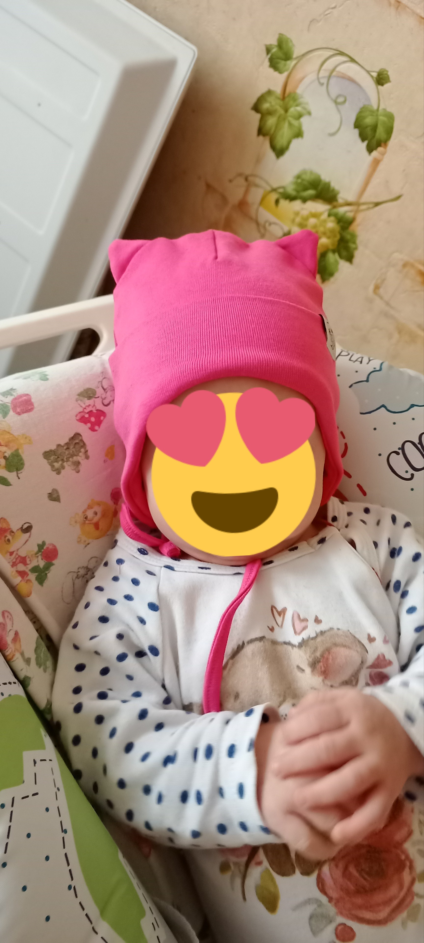 Шапка на завязках для девочки Baby Go цвета фуксии, с ушками. Декорирована нашивкой.